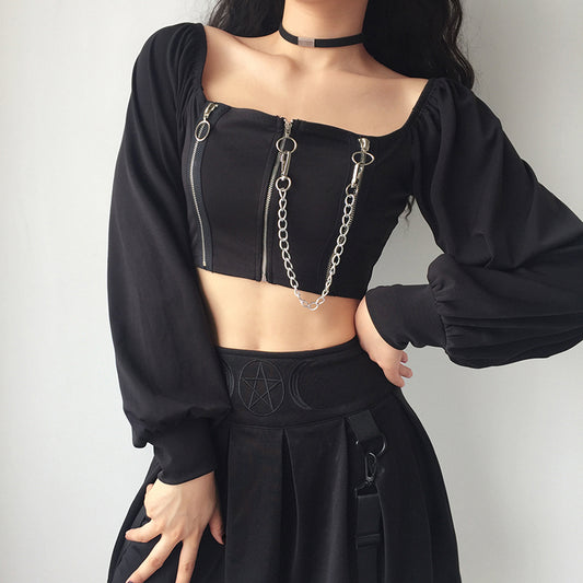 "DARK CHAIN SQUARE COLLAR PUFF SLEEVE" TOP K111608