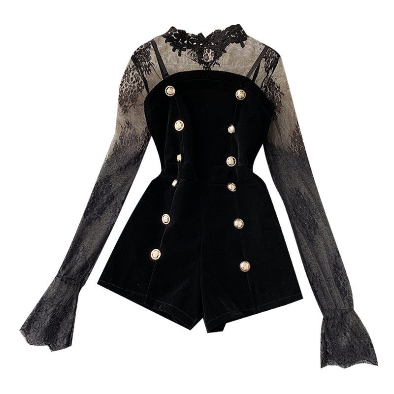 "BLACK LACE EMBROIDERED VELVET" JUMPSUITS N042404
