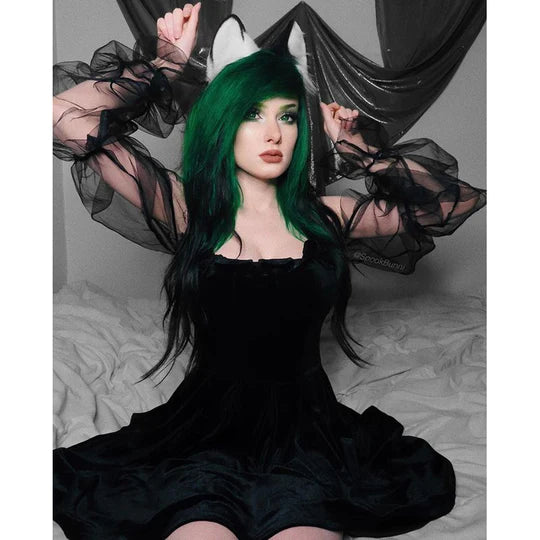 Black Puff Sleeve Off-shoulder Velvet Pleated Dress UB96037
