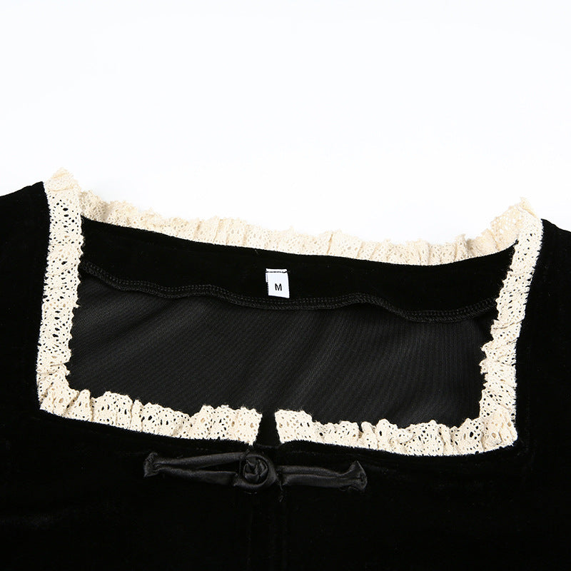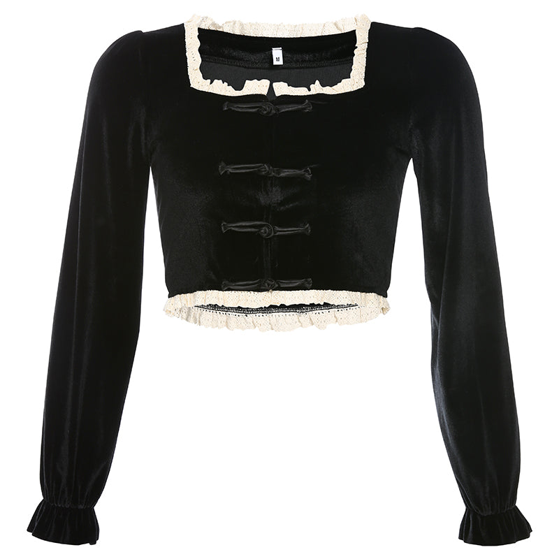 "BLACK RETRO VELVET LACE SQUARE COLLAR" CROP TOP K111601