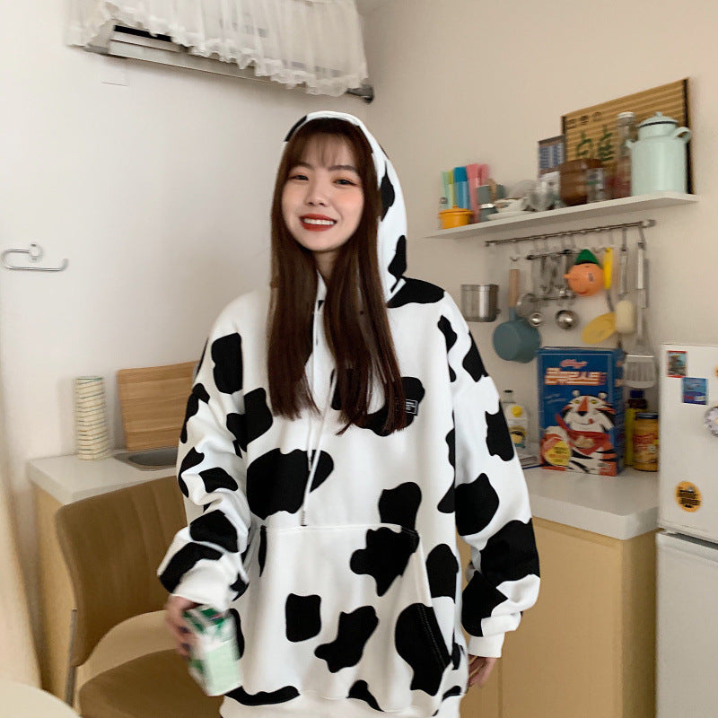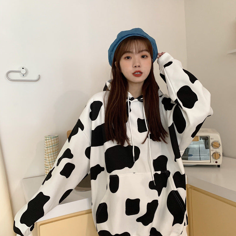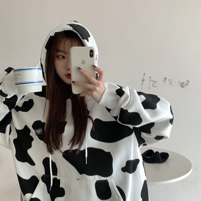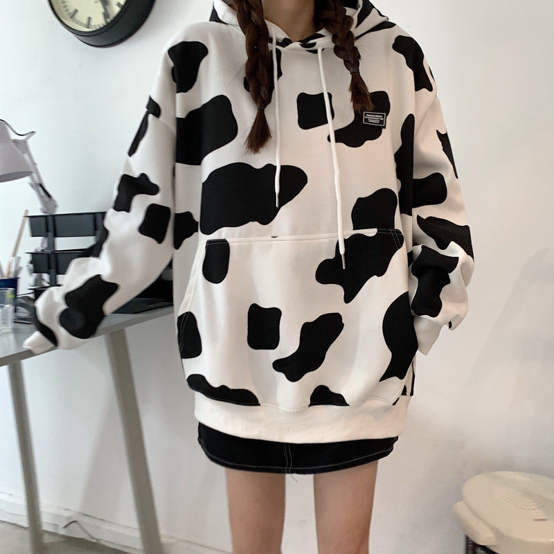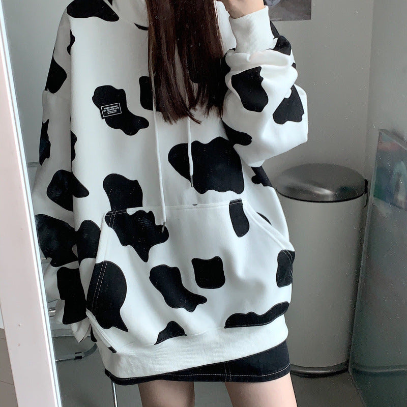 BLACK WHITE COW PATTERN HOODED SWEATSHIRT UB2828