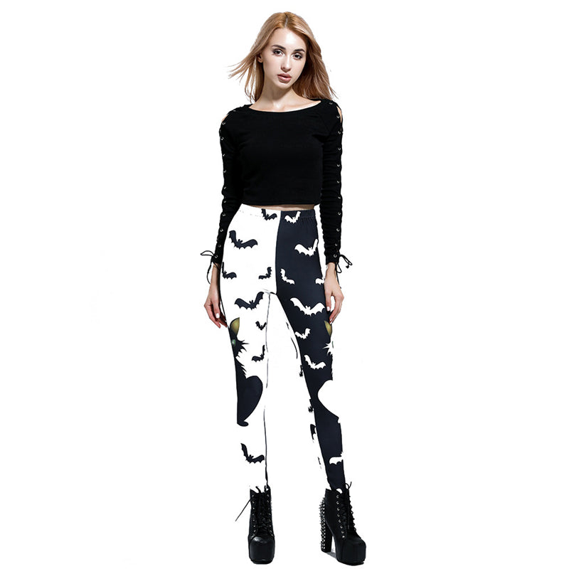 "BLACK WHITE STITCHING CAT BAT PRINT" LEGGINGS N042705