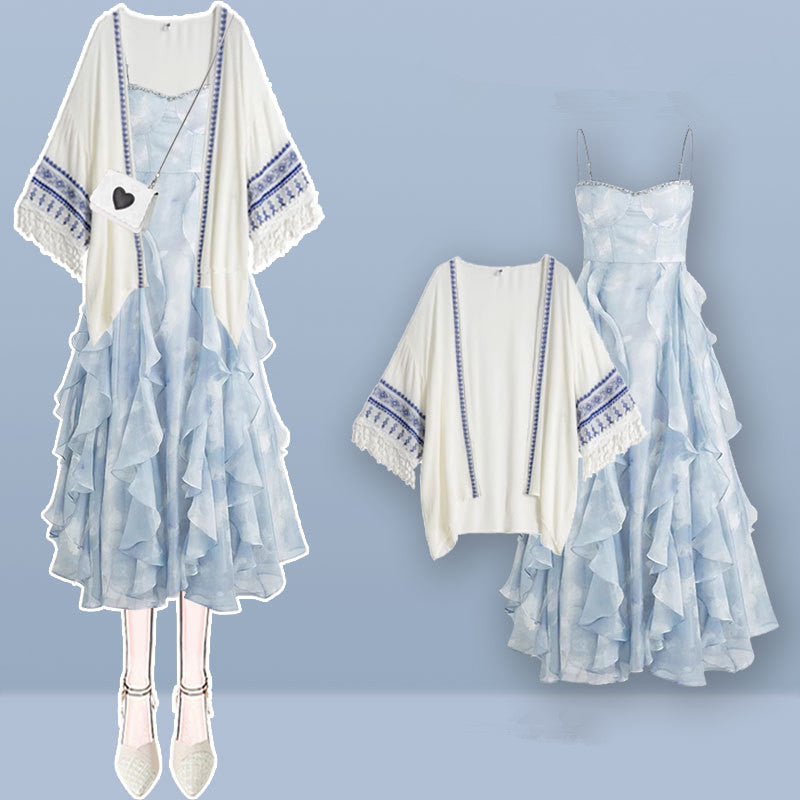 Blue Suspender Dress+Cardigan Two-piece Set UB99158