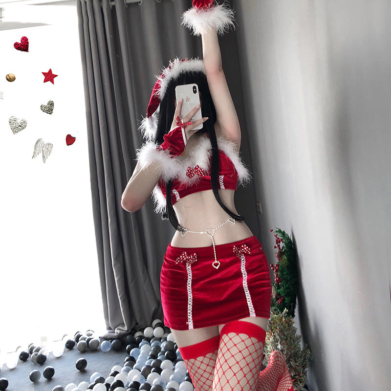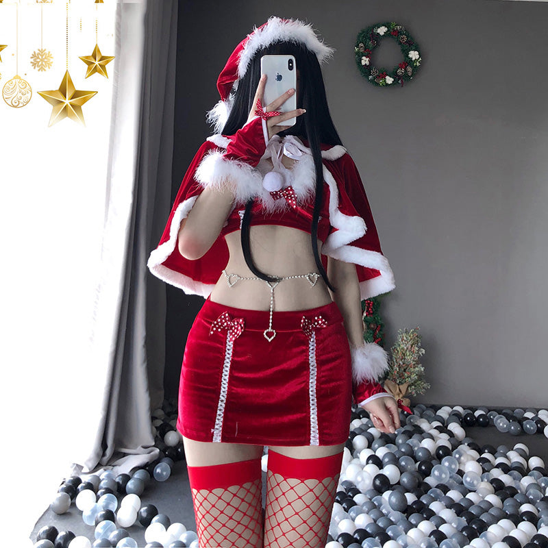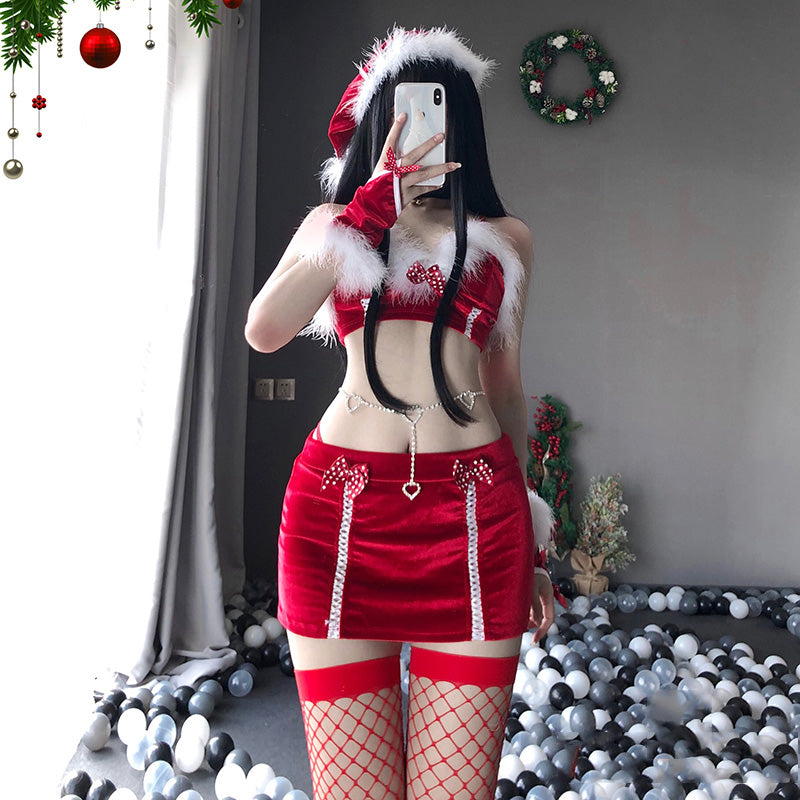 Set includes: top+ skirt + hat + sleeve*2 + stockings+panties