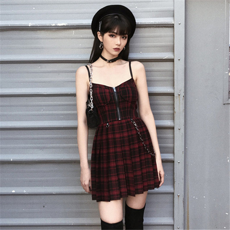 "RED BLACK PLAID PLEATED STRAP" DRESS D060503