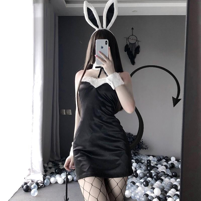 Set includes: dress + bunny ears headband + collar + cuff*2+t-back