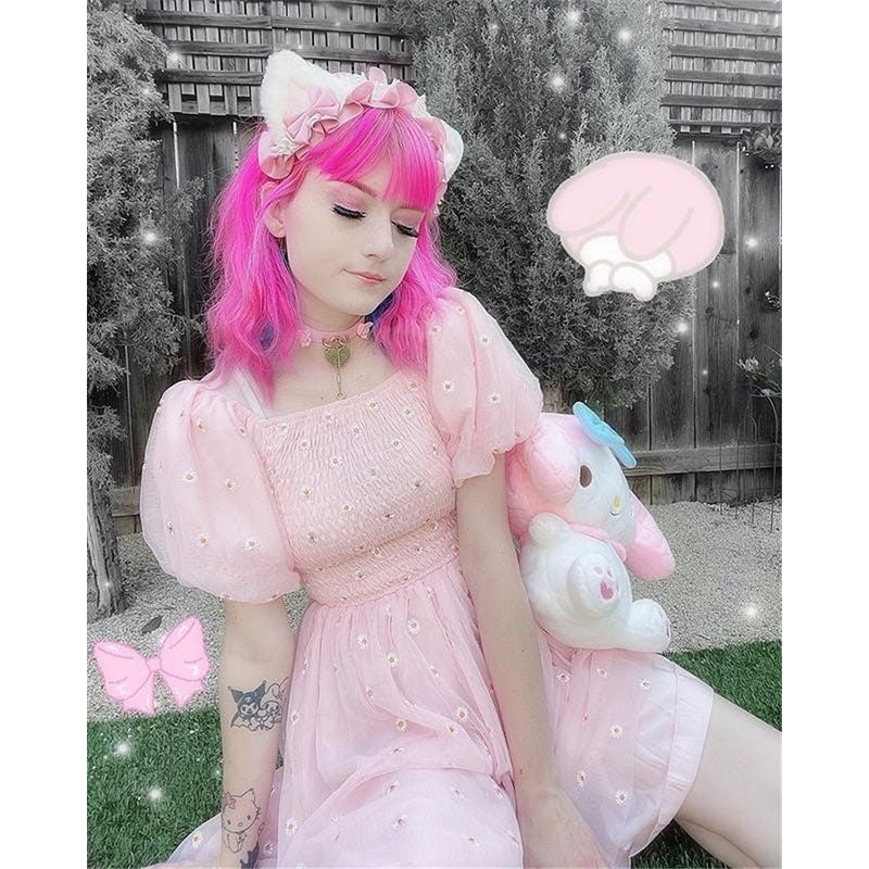 "DAISY EMBROIDERED PUFF SLEEVE MESH" DRESS N050601