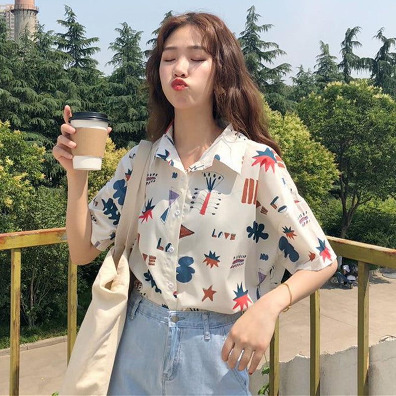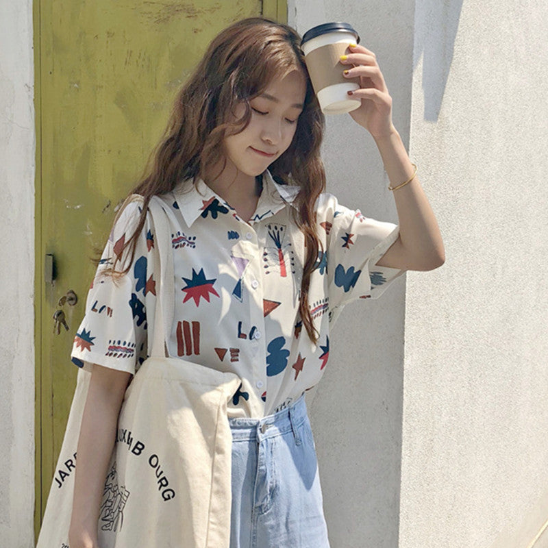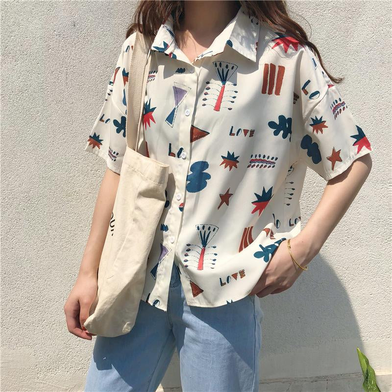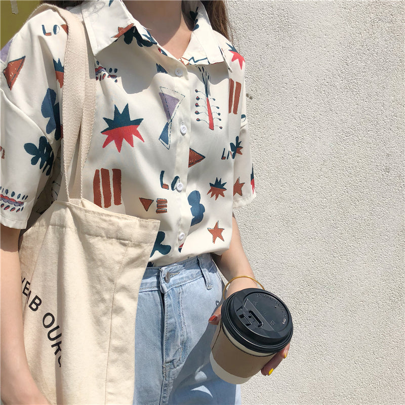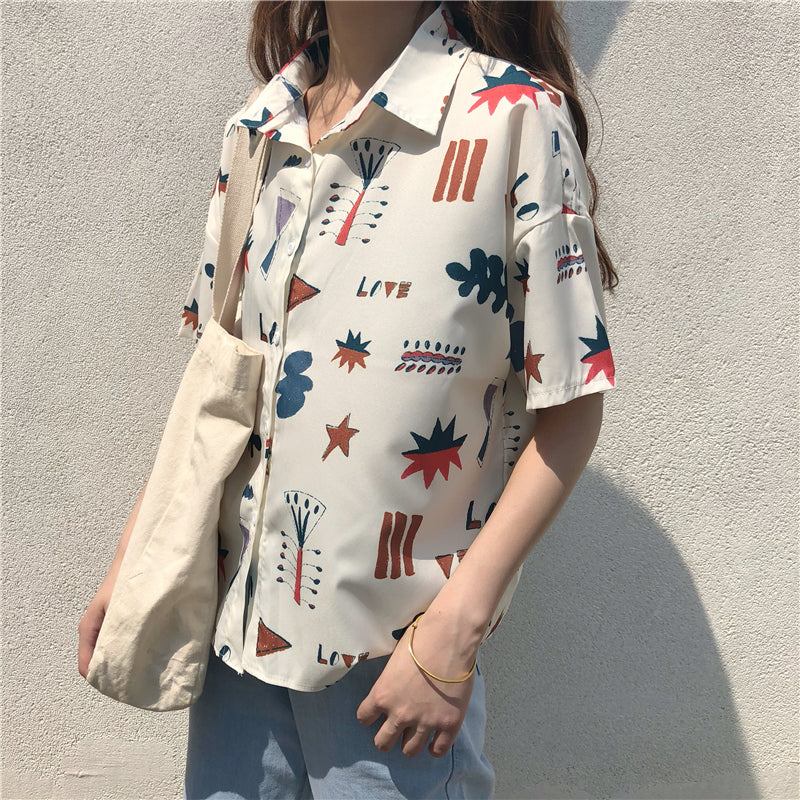 "GEOMETRIC CARTOON LOVE PRINTED SHORT-SLEEVED" SHIRT D052905