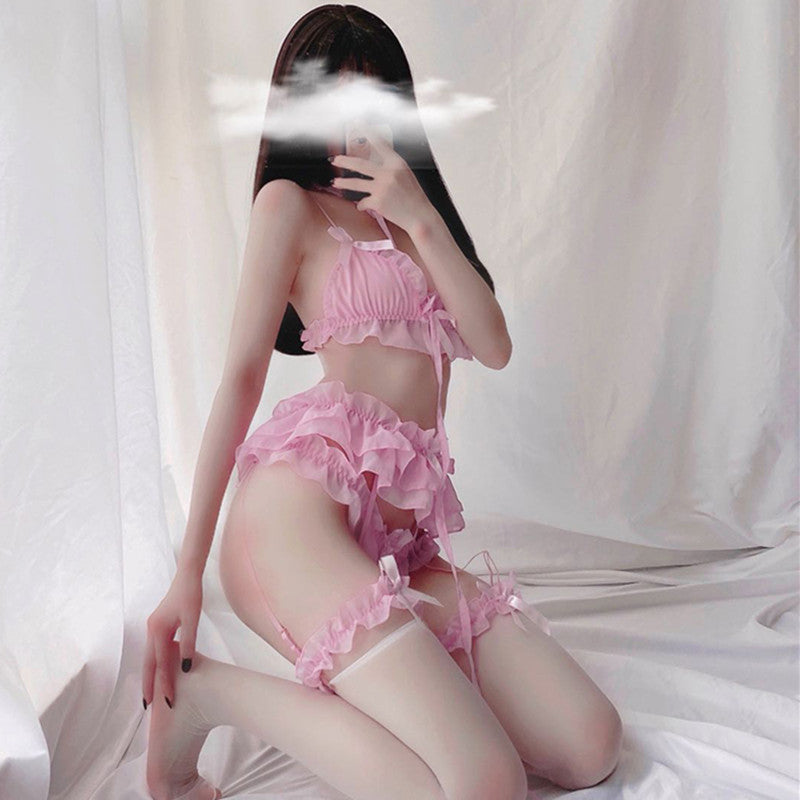 Set includes: neck ring + bra + garter + panties + leg ring * 2
