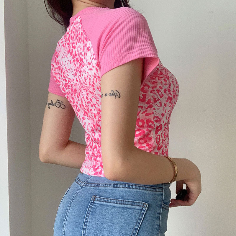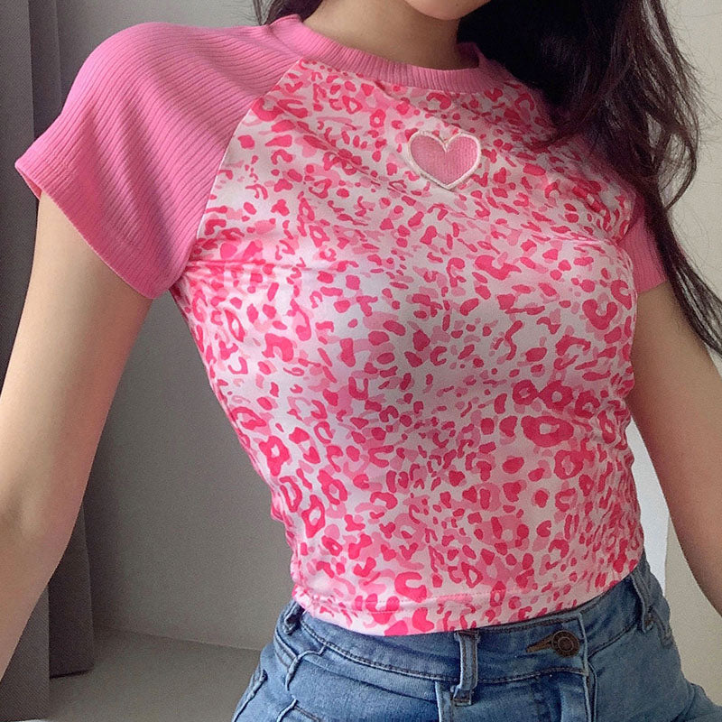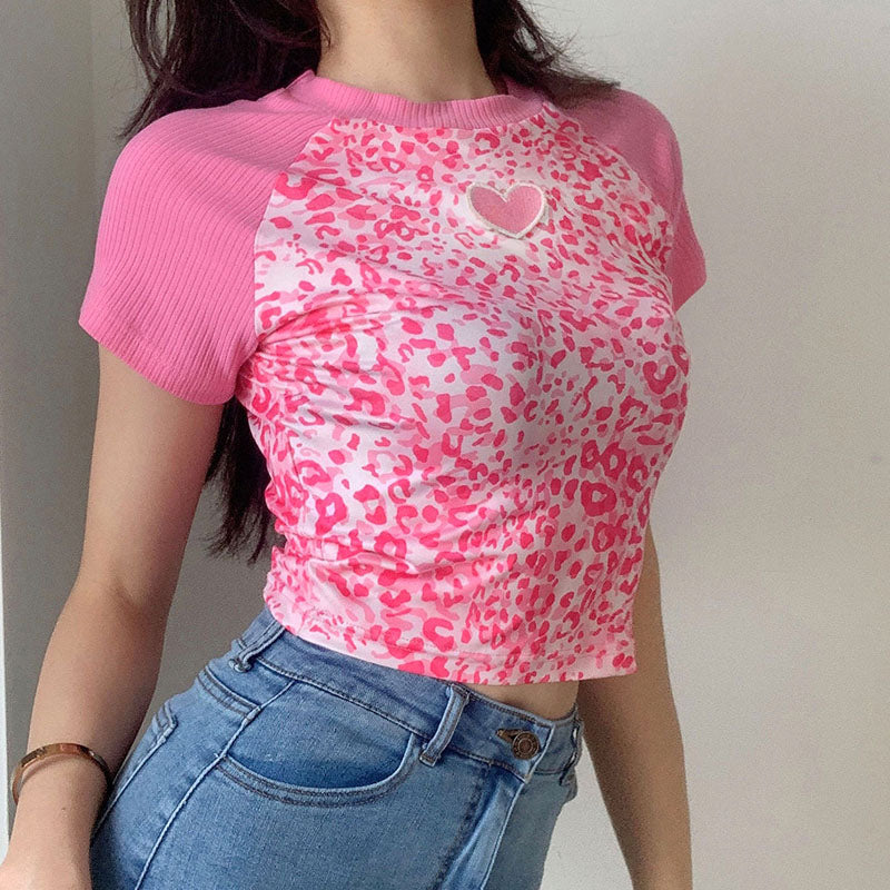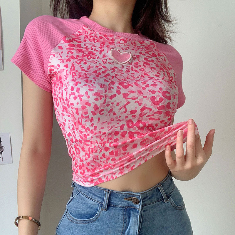 "PINK LEOPARD PRINT LOVE EMBROIDERY" CROP TOP N033004