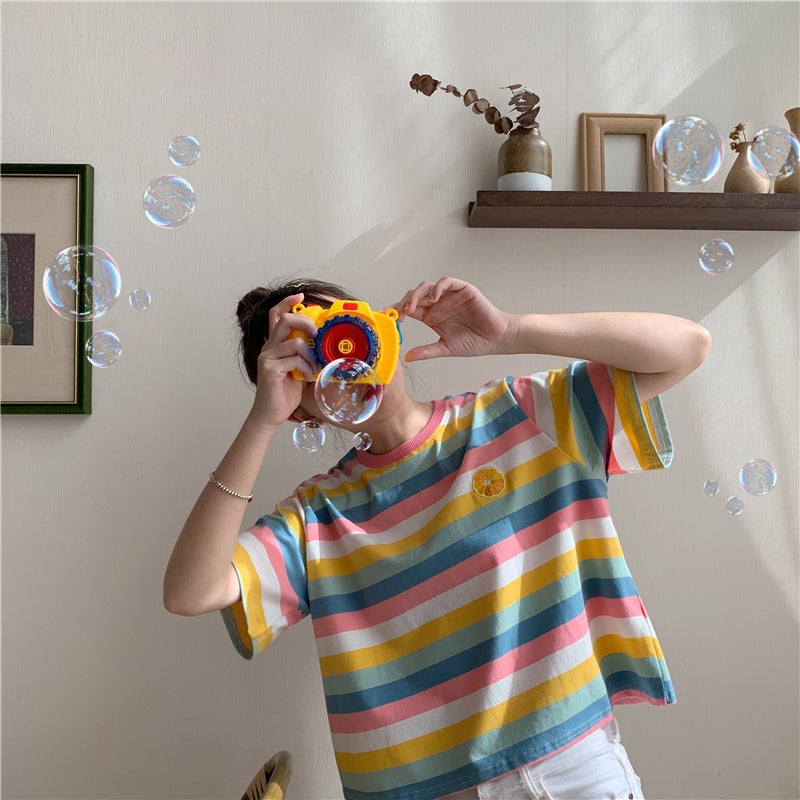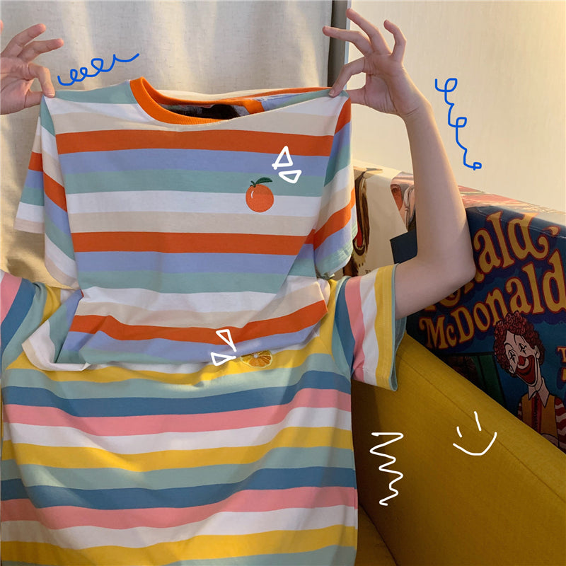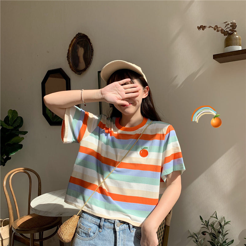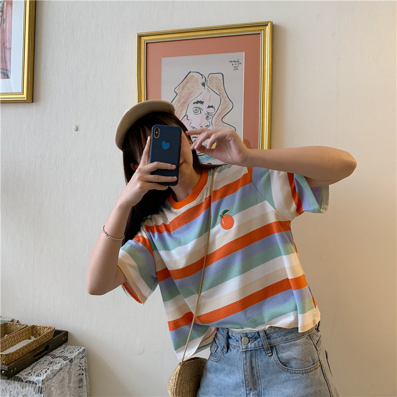 "RAINBOW STRIPED EMBROIDERY FRUITS" T-SHIRT N072209