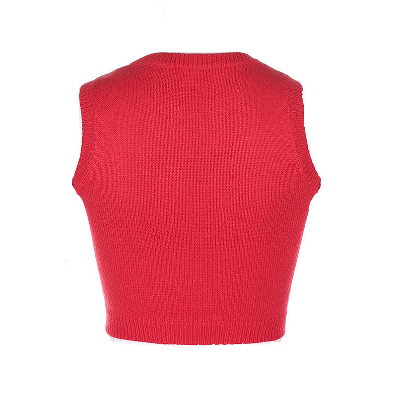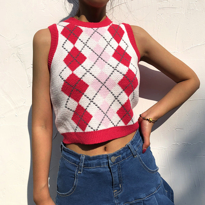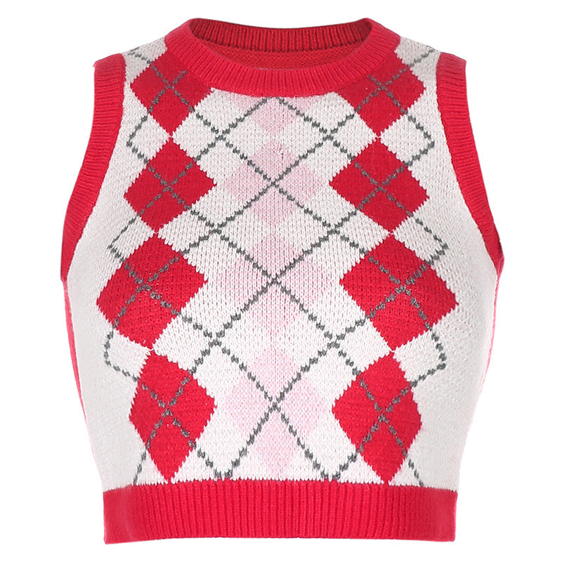"RED DIAMOND CHECK SWEATER" CROP VEST N103004