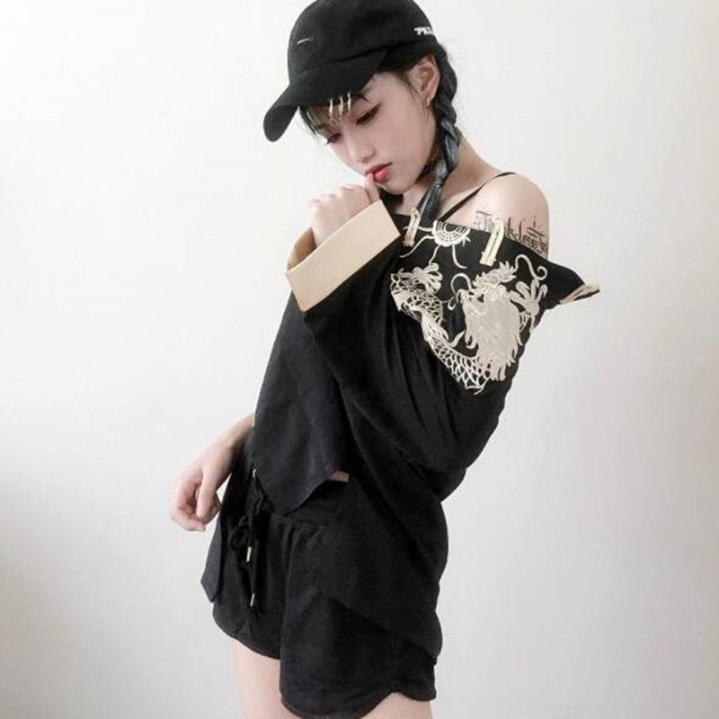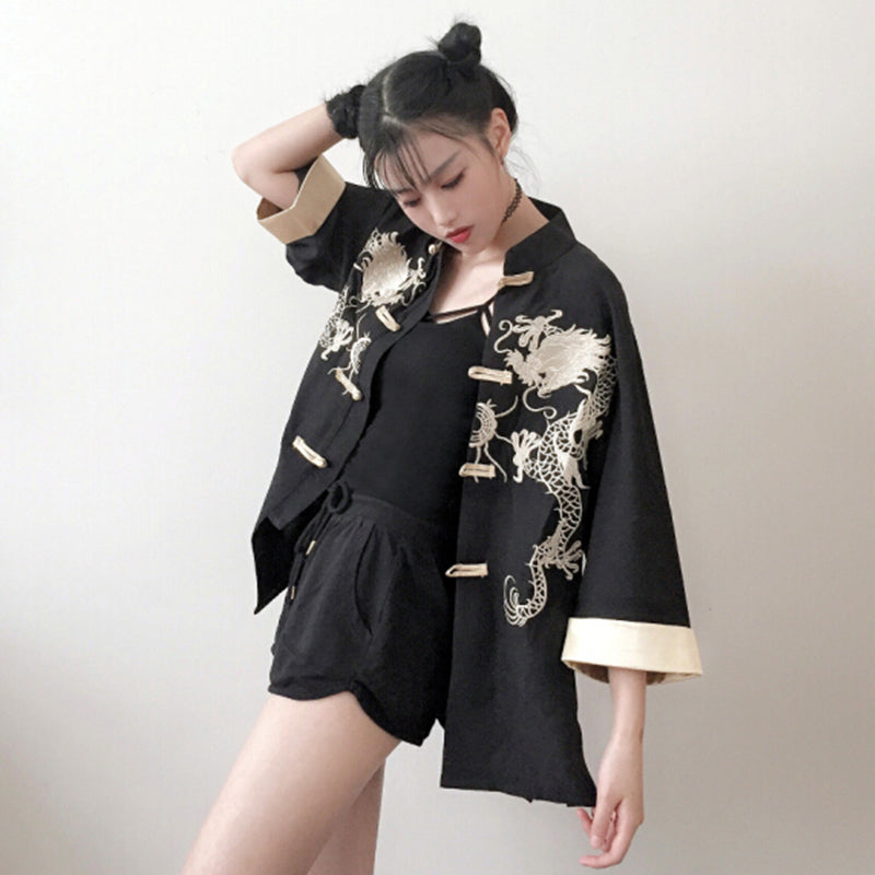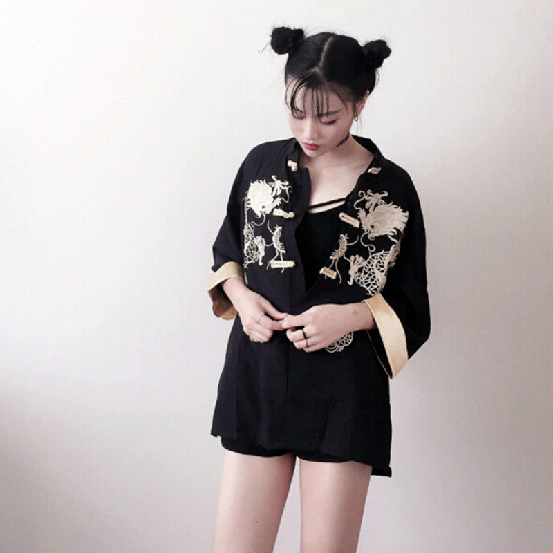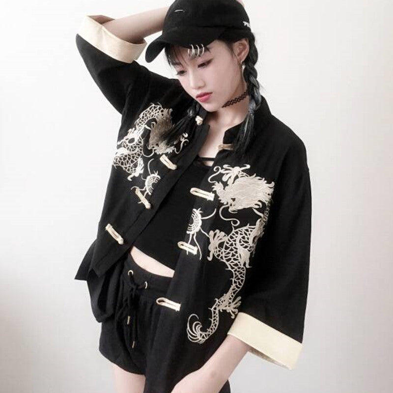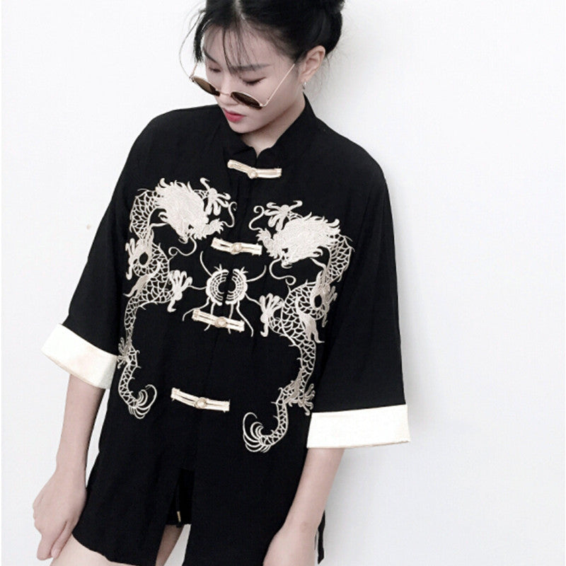 "RETRO EMBROIDERED DRAGON" HALF SLEEVE SHIRT K071501