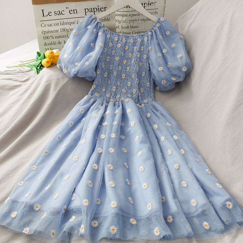 "DAISY EMBROIDERED PUFF SLEEVE MESH" DRESS N050601